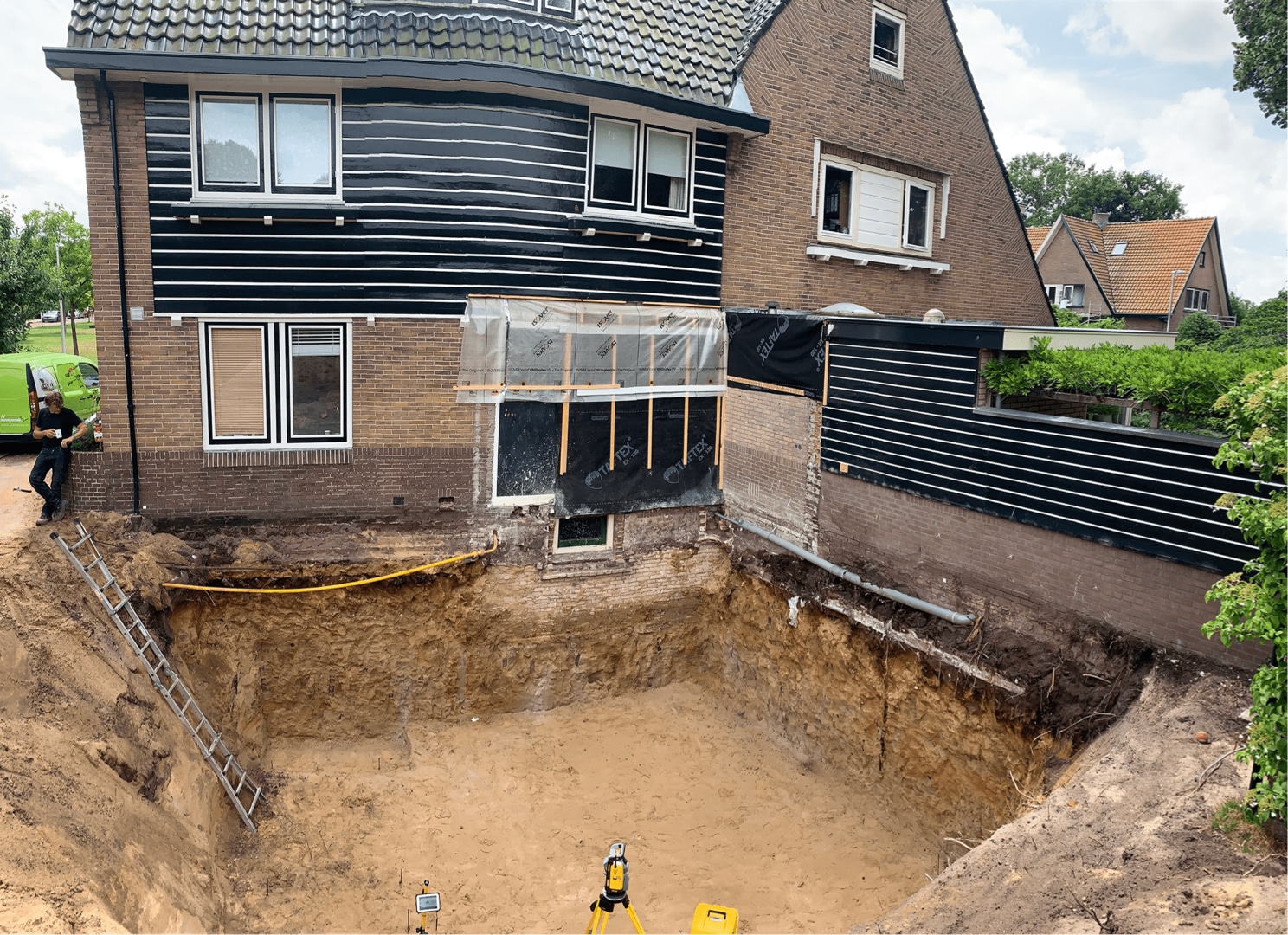 Voor het creëren van een kelder moest er grondinjectie toegepast worden. Grondinjectie Nederland voerde de waterglasinjectie uit inclusief geo-technische rapportage. Mooi detail is de bestaande kelder op de foto.